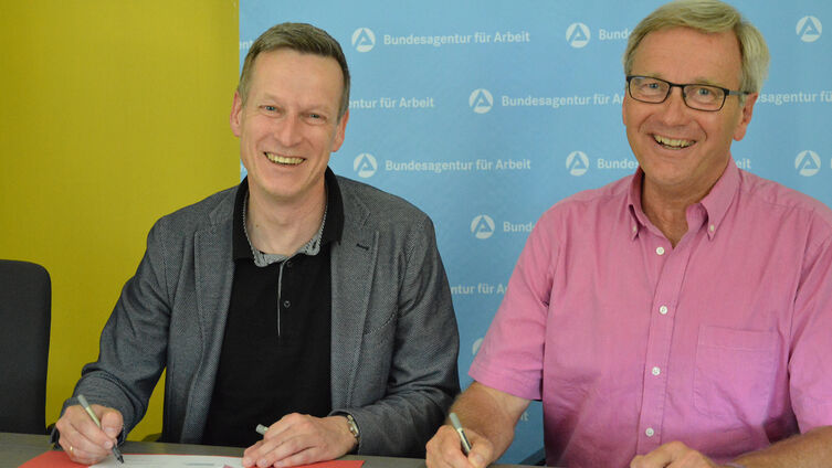 Zwei Unterschriften zum Wohle derer, die in Schleswig-Flensburg Zuflucht finden: Am Mittwoch, 26.6.2019 haben Hans-Martin Rump als Vorsitzender der Geschäftsführung der Agentur für Arbeit Flensburg und Diakoniepastor Thomas Nolte eine Kooperationsvereinbarung unterzeichnet.