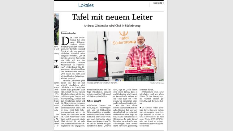 Artikel aus den Zeitungen des "sh:z" zum neuen Leiter der Süderbraruper Tafel