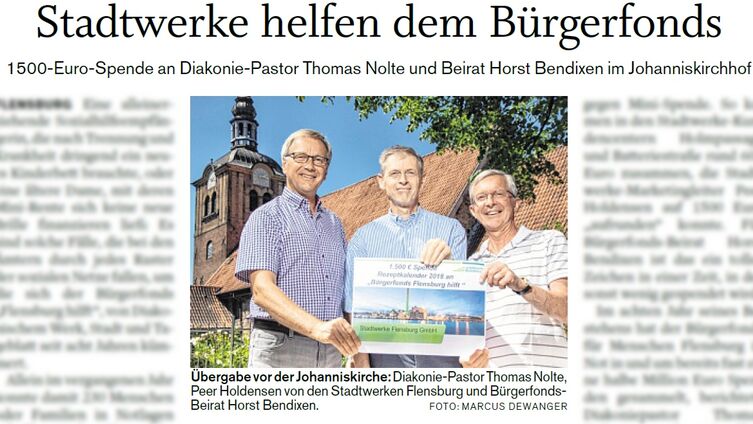 Die Flensburger Stadtwerke unterstützen den Bürgerfonds und übergaben Diakonie-Pastor Thomas Nolte und Beirat Horst Bendixen eine Spende in Höhe von 1.500 Euro.