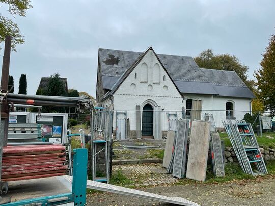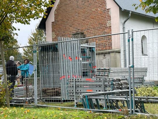 Nach den letzten Zügen der Voruntersuchungen und statischen Begutachtungen im August und September ist seit Mitte Oktober ist unserer Kirche eingerüstet. Nach Tagen des Regens haben seit dem 2. November 2021 die Handwerker mit ihren Arbeiten begonnen. Mit Kaffee und Apfelkuchen sind sie herzlich willkommen geheißen worden. Seitdem befestigen und mauern sie die Mauerkrone auf. Dabei wurde der Rundbogen eines alten zugemauerten Fensters gefunden. Möglicherweise stammt der aus der Anfangszeit unserer Kirche. Auch das Material mit dem der entstandene Hohlraum nur teilweise aufgefüllt gefunden wurde ist möglicherweise von bauhistorischer Bedeutung. Es bleibt spannend. Aber es geht voran. Auch im Winter an den trockenen und milden Tagen.