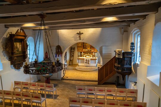 Taufe: 1858 mit Deckel und Taube; schmiedeeiserner Taufleuchter von Carl Munnecke (Schmiede Hollmühle, 1998); wertvolle Taufschüssel mit Darstellung des Sündenfalls 17./18. Jh.; Taufbaum Arbeit aus Uelsby (Martina v.d.Burg); Kanzel 1610/1620: mit Reliefbildern am Korb: 1. Vekündigung und Schrifttafel „siehe, eine Jungfrau ist schwanger und wird einen Sohn bekommen“ (Jes.6); 2. Geburt Christi und Schrifttafel „Das Wort ward Fleisch und wohnte unter uns“; 3. Beschneidung und Schrifttafel „der Junge wurde im Tempel beschnitten und erhielt den Namen Jesus“; 4. Kreuzigung und Schrifttafel „er ist hingegeben wegen unserer Sünde“. Hermendarstellungen (Tugendfiguren); Löwenkopfmasken; Sanduhr viertlg. mit Inschrift „Gott allein die Ehre“; Kanzeltreppe 19. Jh., Kirchenschiff: 18 Bankreihen und 30 Einzelstühle; hölzernes Epitaph an der Nordwand: Auferstehungsbild (Rahmen 1600, Bild 19. Jh. im Nazarenerstil); Inschrift: „Er ist unser Friede“, Schriftworte aus Matthäus 28. Geschnitzter Kronleuchter und Christuskopf über der Tür zum Vorhaus mit den Buchstaben A und O: früherer Dorflehrer Christian Matthiesen (Initialen C und M), 1948.