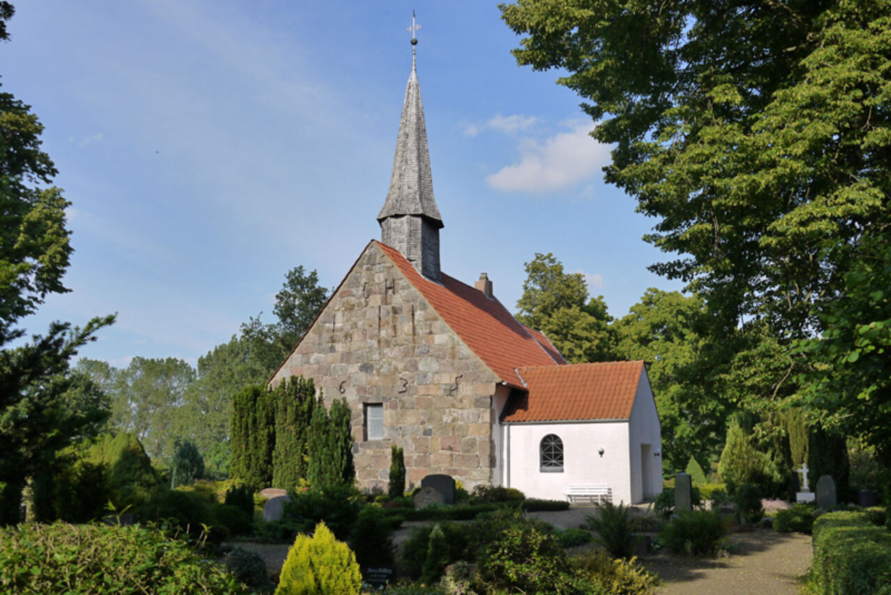 Baugeschichte Kirche Uelsby: Lage auf einem Hügel (der noch aus der Steinzeit stammen soll) zwischen der Quastruper und Uelsbyer Au, abgelegen vom Dorfkern Uelsby, über eine alte Allee (heute Fußweg) von der Dorfmitte erreichbar (Überweg über das Grundstück des Uelsbyer Sanatorium „Villa Wilhelma“) oder die geteerte Straße „Kirchweg“ (außerhalb des Dorfes Richtung Satrup, erste Straßenkreuzung an der Straße nach Satrup rechts). Legende erzählt, dass ein adeliges Fräulein die Kirche erbauen ließ, weil ihr Schoßhund beim Kirchgang nach Struxdorf (älteste Kirche der Region) gebissen wurde…