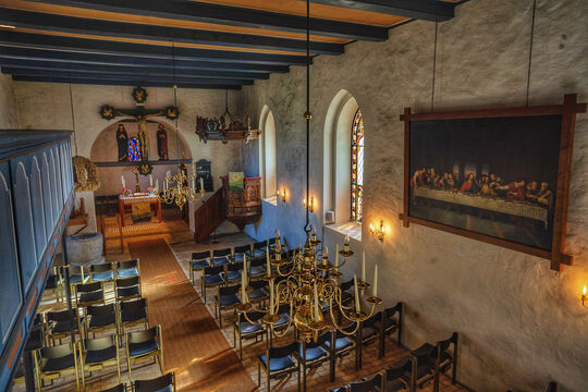 Innen wird das Schiff, dessen Längeneindruck durch die Nordempore von 1773 optisch verstärkt wird, von einer flachen Holzbalkendecke überspannt. Die Flachdecke des Chores von 1846 zeigt in der Mitte ein Dreieck als Symbol des Auges Gottes, von dem Strahlen ausgehen.