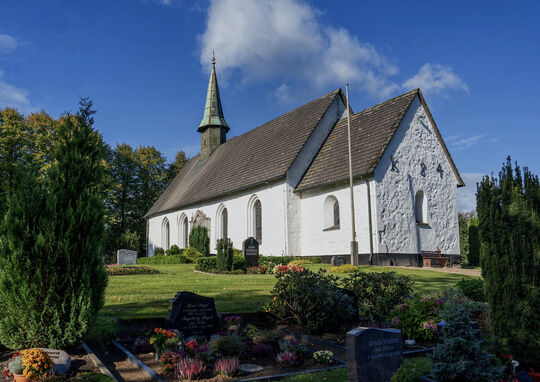 Die Ecken des weiß gestrichenen Mauerwerks sind am romanischen Teil sorgfältig aus behauenen Quadern aufgesetzt. Der Westgiebel erhielt 1695 eine Granitquaderverblendung. Bei einer umfassenden Renovierung 1863 ersetzte man die darauf gemauerten romanischen Portale im Norden und im Süden (hinter der Gefallenenehrung 1914-18) durch ein neues Westportal mit Vorhaus, gab den bereits früher vergrößerten Fenstern des Schiffes eine einheitliche Spitzbogenform und erneuerte den Chorgiebel.