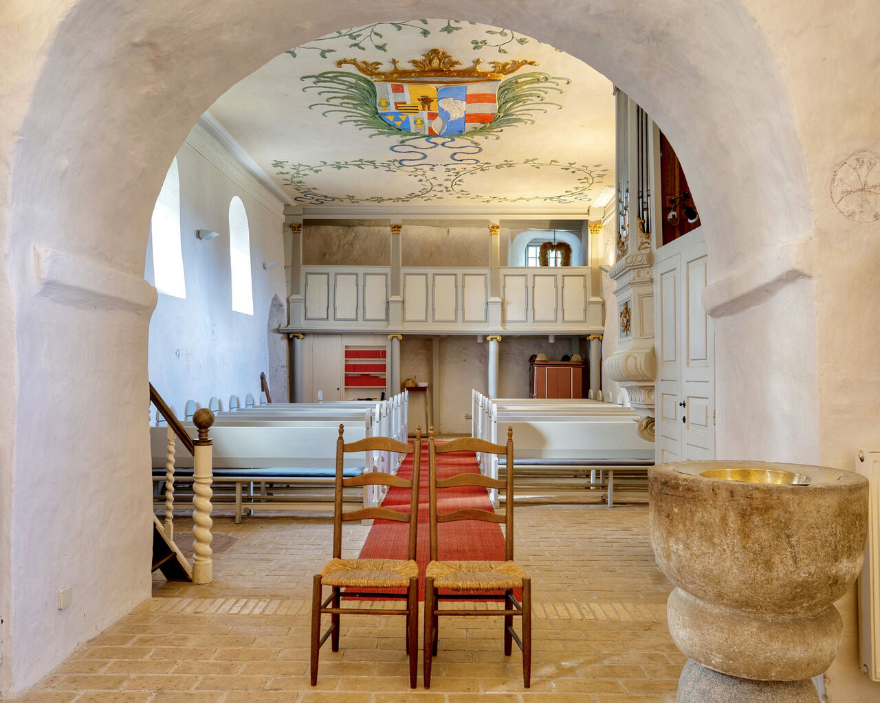 Gegenüber die Orgel, die Johann Friedrich Haenel 1746 für die Kapelle des Schlosses Drage anfertigt.