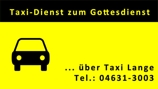 Seit geraumer Zeit bietet unsere Kirchengemeinde einen Taxi-Dienst zu unseren Gottesdiensten an. Sollten Sie es aus gesundheitlichen und auch finanziellen Gründen nicht mehr schaffen, an unseren Gottesdiensten in der Auferstehungskirche teilzunehmen, können Sie Taxi Lange unter der Rufnummer 04631-3003 benachrichtigen. Sie werden dann kostenfrei zur Kirche und anschließend wieder nach Hause gebracht. Die Kosten werden von Taxi Lange direkt mit unserer Kirchengemeinde abgerechnet. Es macht Sinn, sich auch mit anderen an unseren Gottesdiensten Interessierten abzusprechen.