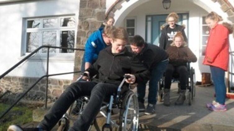 Besonderer Beliebtheit erfreute sich das Rollstuhlfahren. Jeder konnte selbst erleben, wie es ist, auf solch ein Hilfsmittel angewiesen zu sein und in lockerem Kies oder gar auf einer Treppe ohne fremde Hilfe nicht mehr weiterzukommen. Zugleich übten die Konfis das tatkräftige Zupacken und fanden heraus, an welchen Teilen des Rollstuhls man ziehen kann und an welchen besser nicht.