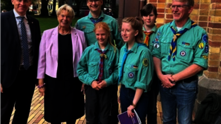 Pfadfinder-Helfereinsatz im Schleswiger Dom: Dort fand am 8. Oktober die Verabschiedung von Bischof Gothart Magaard statt, und Pfadfinder*innen aus unserem Stamm und anderen Stämmen vom REGP hatten überraschend eine schöne Begegnung mit Ministerpräsident Daniel Günther und der Präses der Nordkirchen-Synode Ulrike Hillmann.