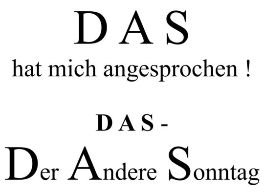 Der gewohnte Gottesdienst mit seinem festgelegten Ablauf, mit den alten Liedern, mit der Predigt von der Kanzel, ist heutzutage nicht mehr jedermanns Sache. Deshalb gibt es die andere, urtümlichere Form des Gottesdienstes - in Husby "DAS - Der Andere Sonntag" - genannt. Es gibt keine festgelegte, immer wiederkehrende Form des Ablaufs. Die Gemeinschaft bringt sich aktiv in den Gottesdienst ein. Jeder darf, muss aber nicht, alles nach Lust und Vermögen. Der Pastor ist mitten in der Gemeinde. Dafür wird jedes Mal ein Thema behandelt, das die Seele anspricht, ihr gut tut und Musik, die uns in der heutigen Zeit anspricht und nahe geht. Die Lieder werden deswegen auch nicht von der Orgel begleitet, sondern von einer Band mit Klavier, Klarinette, Gitarre, Cajon und Sängern. Gemeinde ist noch richtige Gemeinschaft mit der Möglichkeit sich kennenzulernen, Fragen zu stellen und sich neue Kraft für den Alltag und den Weg auf der Suche nach Gott zu holen.