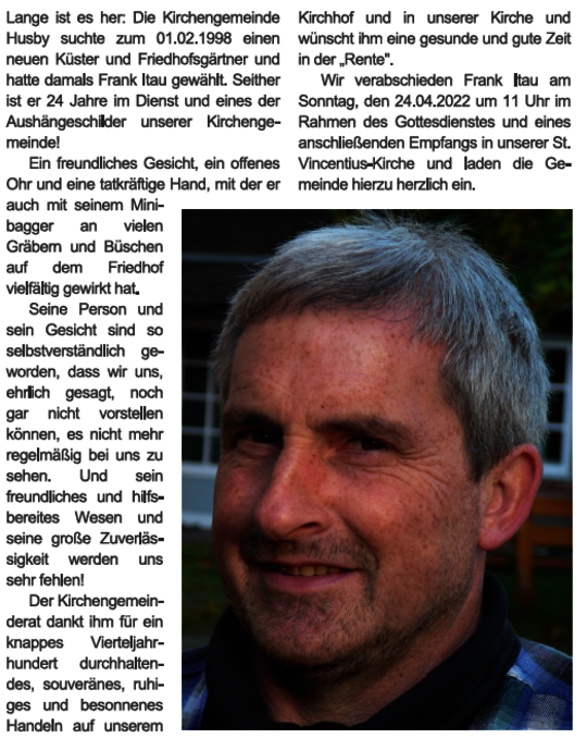 Nach 24 Jahren verabschieden wir uns von unserem langjährigen Küster Frank Itau. Er wird uns immer in Erinnerung bleiben.
