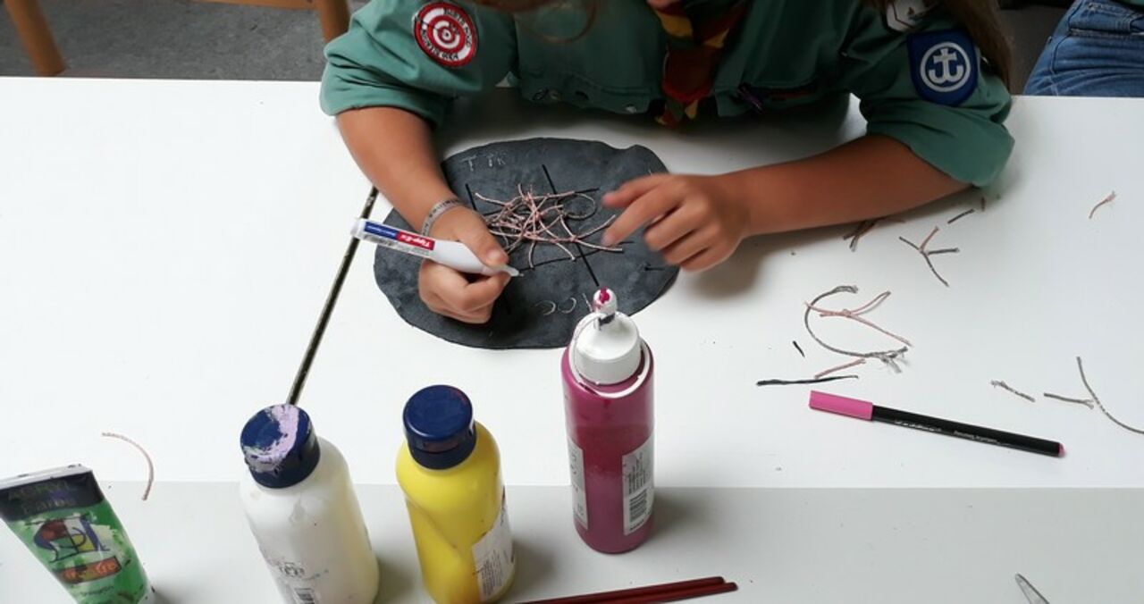 Bei unserere Spielewerkstatt konnte sich jeder ein eigenes kleines Brettspiel bauen. Das Spielfeld wurde aus einem Lederbeutel zurecht gebastelt, indem die Spielfiguren aus bemalten Steinen oder Hölzern aufbewahrt werden können. Außerdem bauten wir zusammen ein Wikingerschach und einen Teamkran für unsere Pfadfindergruppe. Hierfür mussten einige Holzklötze gesägt und geschliffen werden.