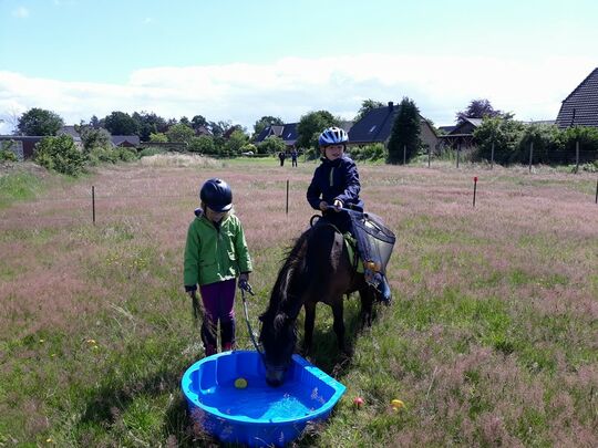 Auf dem Rücken der Ponys gab es verschiedene Spiele, die wir im Zweierteam bewältigen sollten. Wie zum Beispiel Brezel beißen, Eierlauf, Becher transportieren oder Enten angeln.