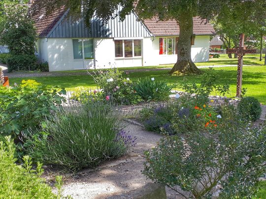 In diesem Bibelgarten kann man die Seele baumeln lassen: Kraft und Hoffnung schöpfen. Denn Gärten in der Bibel sind immer herausragende Orte: Orte der Selbsterkenntnis, der Gottes - und Hoffnungserfahrung. Daher sind Gärten und gerade Bibelgärten wie dieser kleine Bibelgarten Erfahrungs - und Hoffnungsorte. Dies wird unterstrichen durch die Hoffnungsostersteine, die am Kreuz ihren Platz haben.
