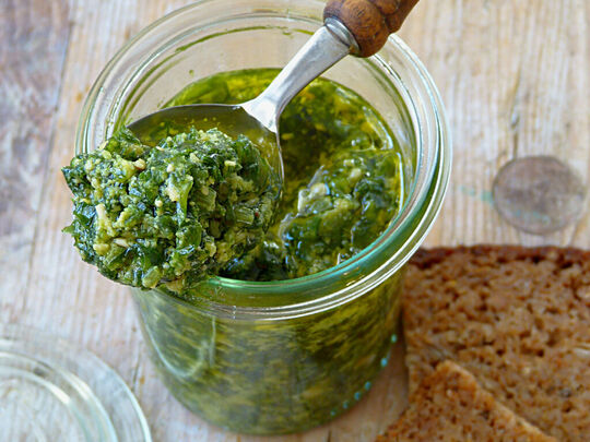 Schmeckt sehr gut als Brotaufstrich mit Frischkäse gemischt, oder in Quark und Creme Fraiche eingerührt als Dip.