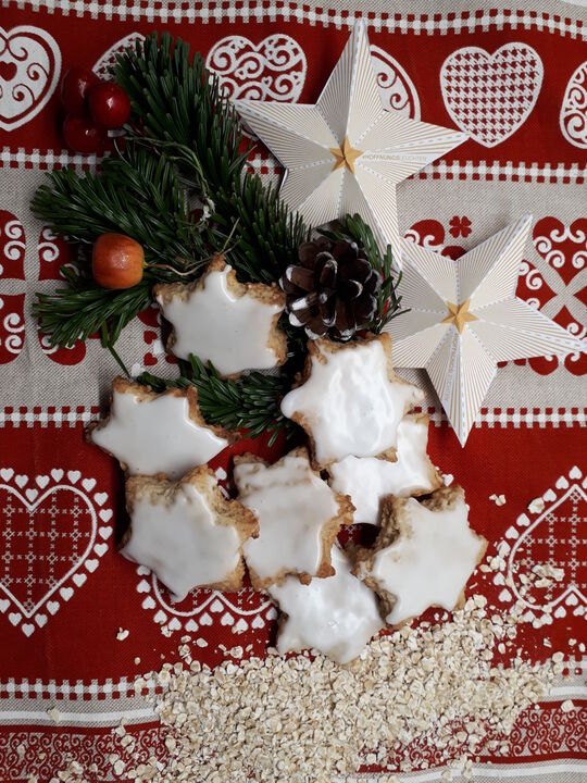 Alle Zutaten für den Teig gut verkneten, evtl. noch etwas extra Mehl unterarbeiten. Teig im Kühlschrank 1 Std ruhen lassen. Anschließend nicht zu dünn (5 - 7 mm) ausrollen und Sterne ausstechen. Auf einem mit Backpapier ausgelegten Blech im Ofen bei ca. 190 °C für 8 - 10 min backen. Die Sterne müssen sich noch etwas eindrücken lassen - nicht zu lange backen. Glasur dickflüssig verrühren und mit einem Backpinsel die abgekühlten Sterne bestreichen.