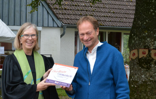 Beim großen Apfelrausch-Fest der Ev.-Luth. Kirchengemeinde Medelby hat Pastorin Anja Kapust am letzten Sonntag (26.9.2021) eine besondere Auszeichnung entgegengenommen: Medelby ist ab sofort oeko-faire Kirchengemeinde - nach Quern-Neukirchen und der Familienbildungsstätte die dritte kirchliche Einrichtung in Schleswig-Flensburg, die dieses Siegel tragen darf.