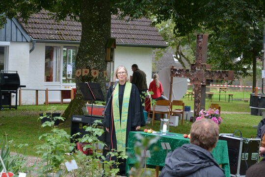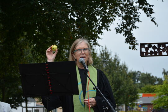 Passend zum Apfelrausch-Fest hat sich Pastorin Anja Kapust in ihrer Predigt beim Openair-Gottesdienst im Medelbyer Bibelgarten auf den Apfel als Frucht der Erkenntnis und die Vertreibung aus dem Paradies bezogen. Sie sagte: „Damals haben Adam und Eva erkannt, dass sie die Verantwortung übernehmen müssen für ihr Tun. Das gilt seitdem und auch heute – auch und gerade im Hinblick auf Umweltschutz und Gerechtigkeit.“ Dennoch gebe es die Kluft zwischen Erkenntnis und dem Tun, denn die Umsetzung sei nicht immer leicht, so Anja Kapust.