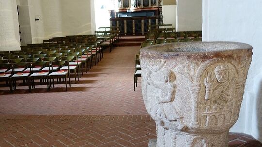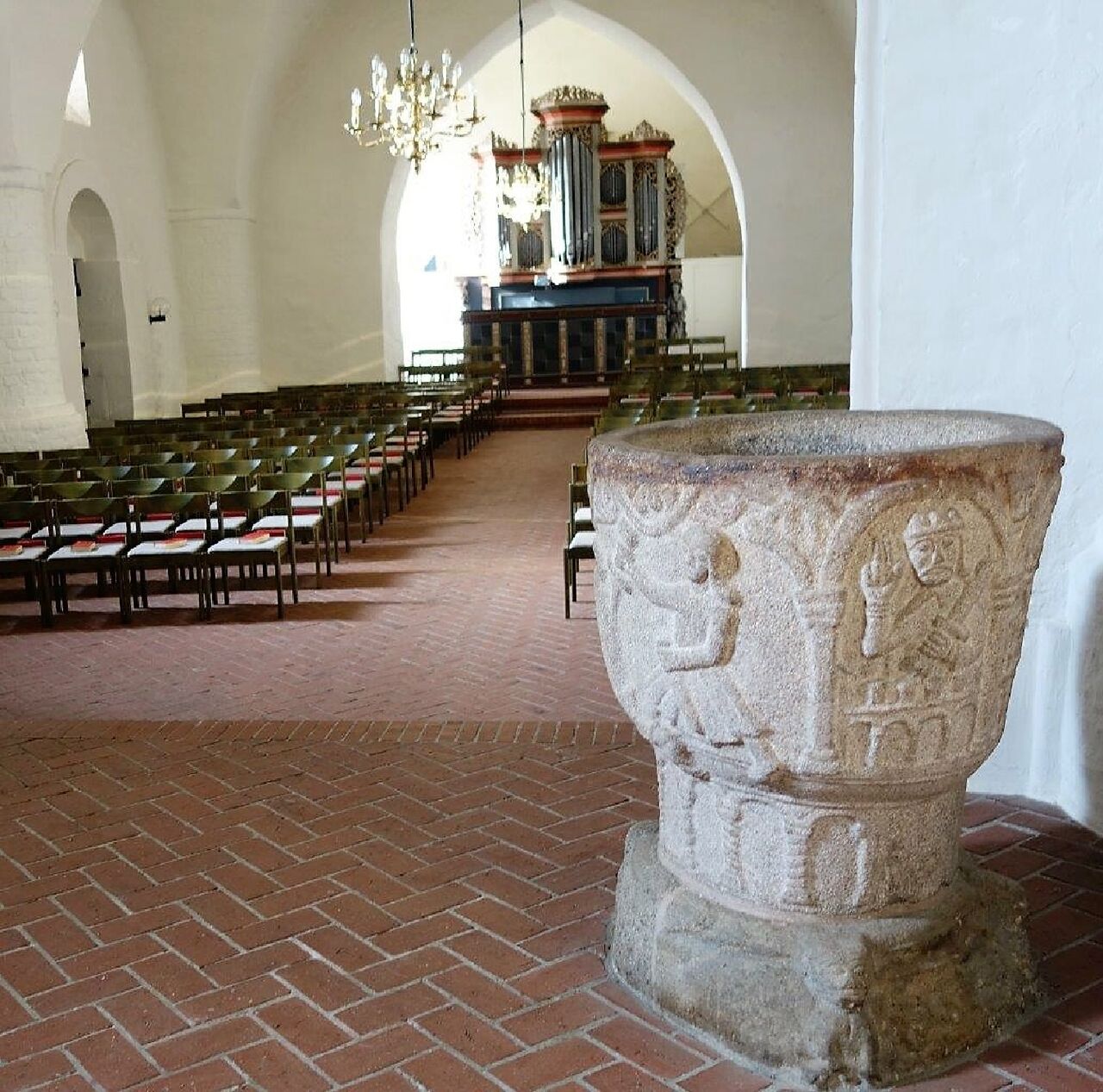Ein wohl zur Schleswiger Granitbauhütte gehöriger Meister schuf in sehr persönlicher Auffassung um 1200 die mächtige Granittaufe. Über den Zinnen seines romanischen Palastes erscheint ein König, in urtümlicher Dramatik kämpfen vier Männer mit einem riesigen, das Böse symbolisierenden Löwen.