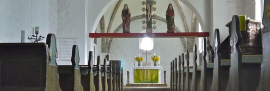 Im Innenraum überspannt eine 1959 vom Restaurator Carl Fey-Thalmühlen ornamental bemalte flache Balkendecke das Schiff. Der Chor erhielt im späten 16. oder frühen 17. Jh. sein Kreuzrippengewölbe zusammen mit dem runden heutigen Chorbogen. Über den gemauerten Altar mit dem schlichten Holzkreuz hinweg blickt man heute auf das romanische Ostfenster. Der barocke, 1743 von Wilhelm Buchholtz in Flensburg geschaffene Altaraufsatz wurde 1983 an die Nordwand des Schiffes gehängt. Der zierliche, vom Sternensymbol Gottes gekrönte Aufbau umschließt ein 1854 von F. Rannje gemaltes Kreuzigungsbild.