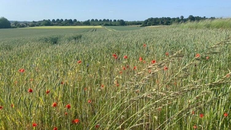 Sommer! In der Morgensonne Tau auf dem Rasen, der Weizen wächst in hellem Grün, Blumen und Blüten im Garten, Schmetterlinge, Spargel und Erdbeeren... Ein Bild des Segens.