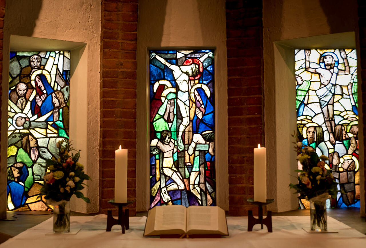 Hier zeigen wir einige Bilder aus dem Innenraum der Kirche, den Altar mit den Käte-Lassen-Fenstern, die Bänke und den Orgelprospekt.