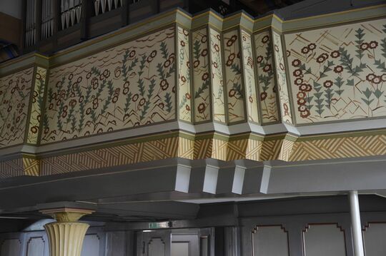 Die Malereien wurden mit den originalen Malmaterialien, nämlich Ölfarben für Gestühl und andere Bauteile sowie matten Casein-Farben für die Decke, ausgeführt.