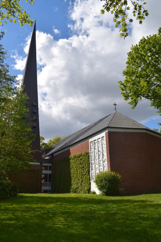 Sie wurde 1960 gebaut, und das Besondere ist, dass sich Kirche und Gemeinderäume in einem Gebäude befinden. In der Kirche fallen die schönen Fenster von Ernst Günter Hansing und die Altarbilder von Fritz Fleer ins Auge.