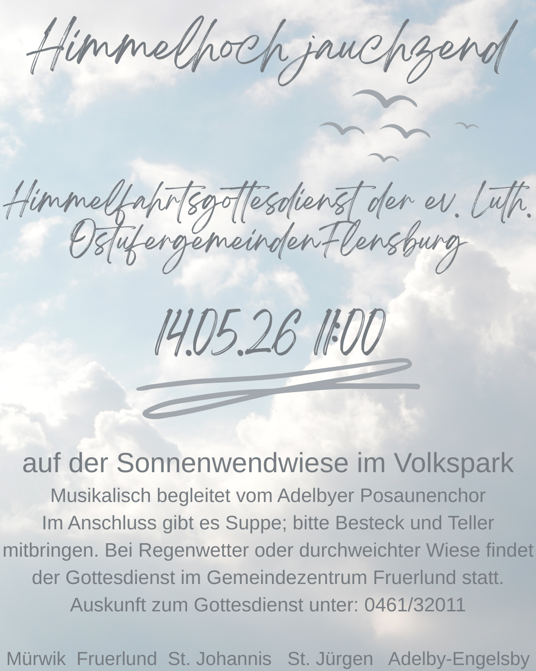 Die Gemeinden Mürwik, Fruerlund, St. Johannis, St. Jürgen und Adelby-Engelsby feiern gemeinsam diesen Gottesdienst. Es gibt anschl. Spargelsuppe und weitere Leckereien für einen kleinen Preis. Bitte Besteck und Teller mitbringen.