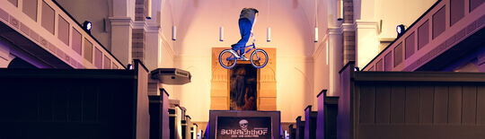 Der Filmemacher Mattis Hansen, selbst früher BMX-Fahrer, hatte schon Bilder im Kopf, die sich dort in der Kirche mit dem Raum verbanden. Das Altarbild: Petrus verliert den Boden unter den Füßen, Jesus hält ihm die Hand hin. Wenn der BMX-Fahrer Vincent Unrath auf das Altarbild zuspringt, ist er in der gleichen Situation wie Petrus, ohne Halt. Ohne Vertrauen geht es nicht.