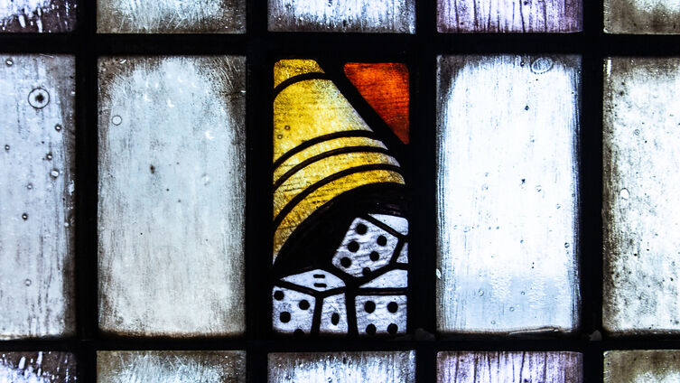 Unsere Kirchenfenster halten viele Überraschungen bereit. Tatsächlich geht es um ein Würfelspiel, das kleine Fenster auf der Empore hat aber einen biblischen Hintergrund. Der Würfelbecher kommt in der Bibel vor, in der Erzählung, die wir am Karfreitag lesen: