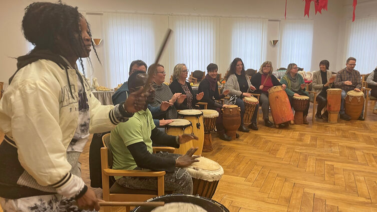 Einer der Höhepunkte der Zusammenkunft für Kita-Leiter*innen am 15.12.2022 in Süderbrarup war neben Andacht, leckerem Imbiss, Weihnachtsreimen auf goldenem Papier und persönlichen Begegnungen der Trommelworkshop. Unter Leitung von Silke sowie Sali und Niamakolo Doumbia waren alle Veranstaltungsgäste eingeladen, mit zu trommeln und der guten Laune einen gemeinsamen Rhythmus zu geben.