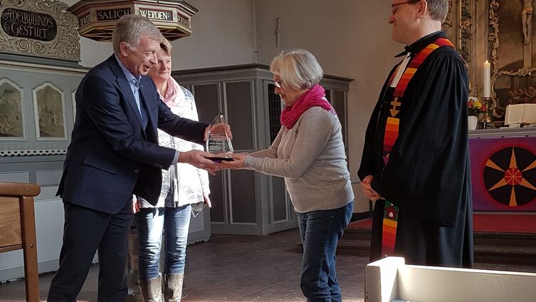 Der mit 2500€ dotierte Preis wurde von Elke König, Vize-Präses der Landessynode, stellvertretend an den Landessynodalen Ulrich Siebert aus Flensburg übergeben – die Mitglieder des Orgelbauvereins Adelby selbst hatten sich wegen des Schnees nicht auf den Weg nach Travemünde gemacht. Sie nahmen den Preis vom „Boten“ Ulrich Siebert in ihrem Gottesdienst am Sonntag, 4.3.2018 in der Adelbyer Kirche entgegen.