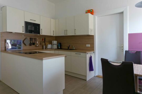 Im Erdgeschoss befindet sich eine gut eingerichtete Küche mit Geschirrspüler und Mikrowelle: