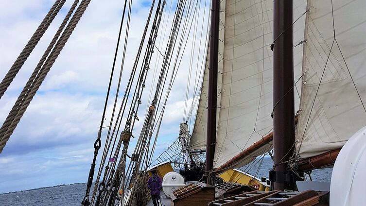 Nach dem Abschlussfeuerwerk der Kieler Woche und einer ersten gemeinsamen Nacht an Bord in Kiel, ging es am nächsten Tag los Richtung Norden. Früh am Morgen wurden unter Anleitung der holländisch-schottischen Crew die Segel gesetzt und Laboe hinter sich gelassen. Trotz starkem Wellengang und ordentlich Wind in den Segeln, wurde das erste Tagesthema erarbeitet: Zusammenhänge und Wechselwirkungen des Klimawandels - Wie funktioniert der Treibhauseffekt und warum gerät das Klima aus den Fugen? Nach einigen Stunden segeln und spannenden Gesprächen erreichte die Gruppe abends ihr erstes Etappenziel: Sonderburg.