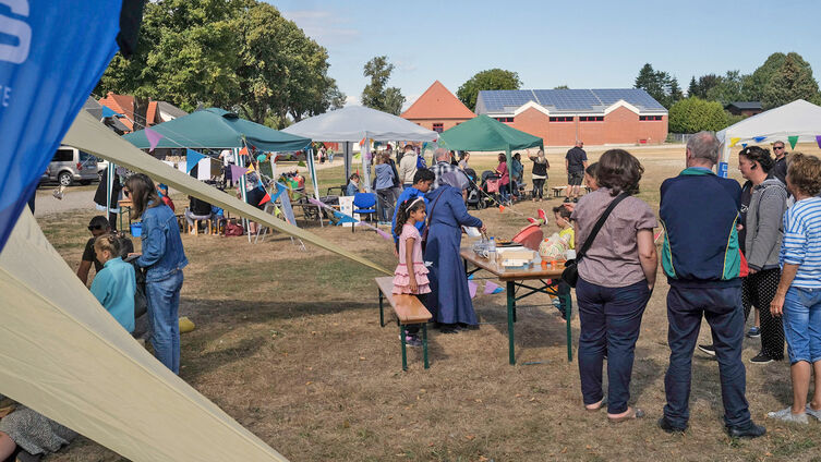 Hochkonzentriert bemalt der kleine Junge seinen „Schmunzelstein“. Da kann er zeigen, wie er sich fühlt. An den vielen Ständen, verteilt auf dem Marktplatz Süderbrarup ist das Angebot vielfältig. Überall können junge Familien etwas Interessantes entdecken...