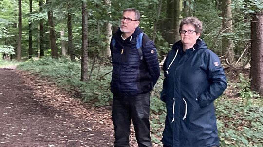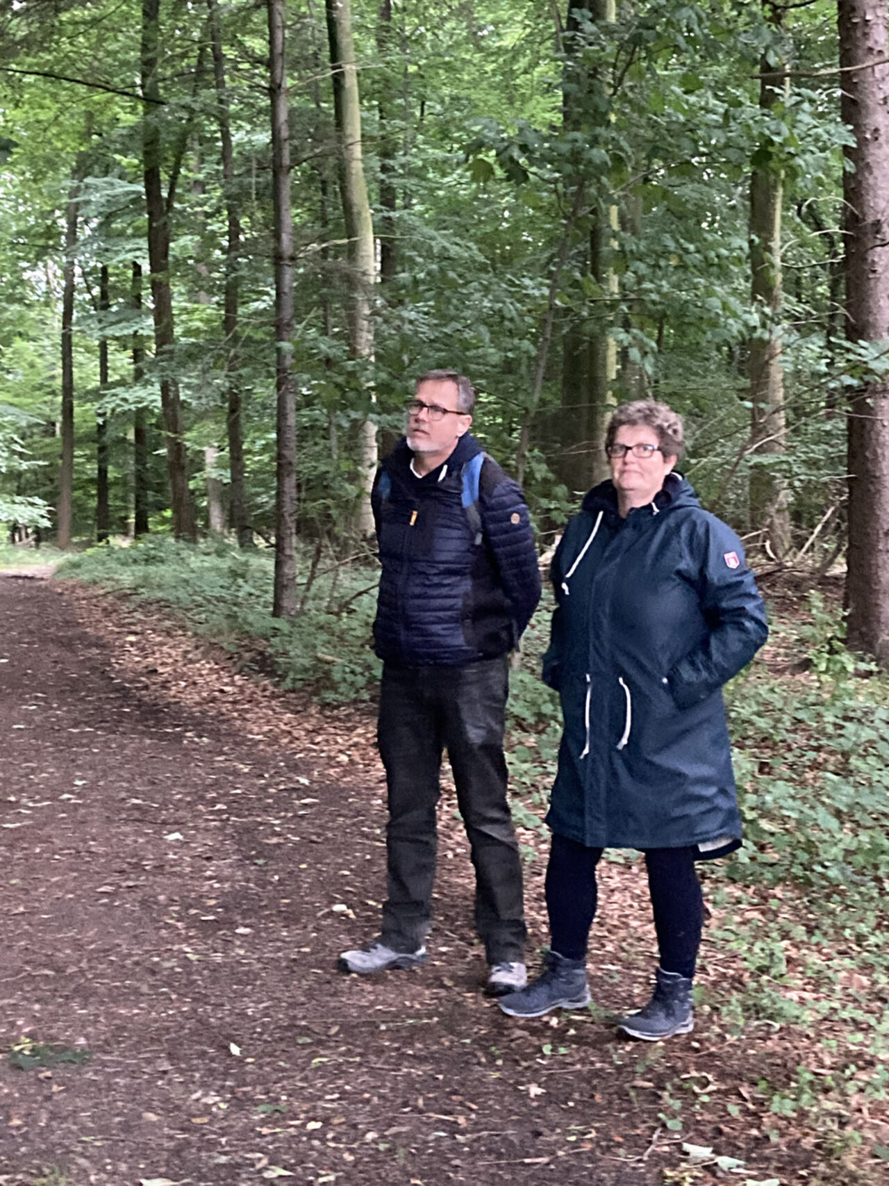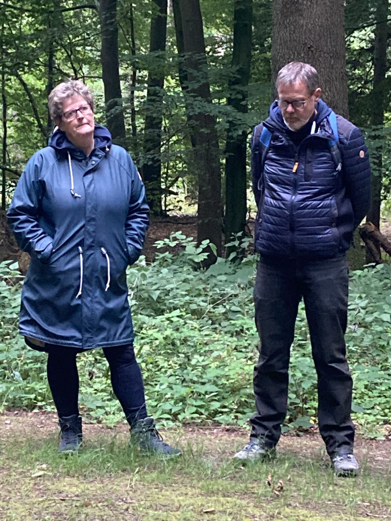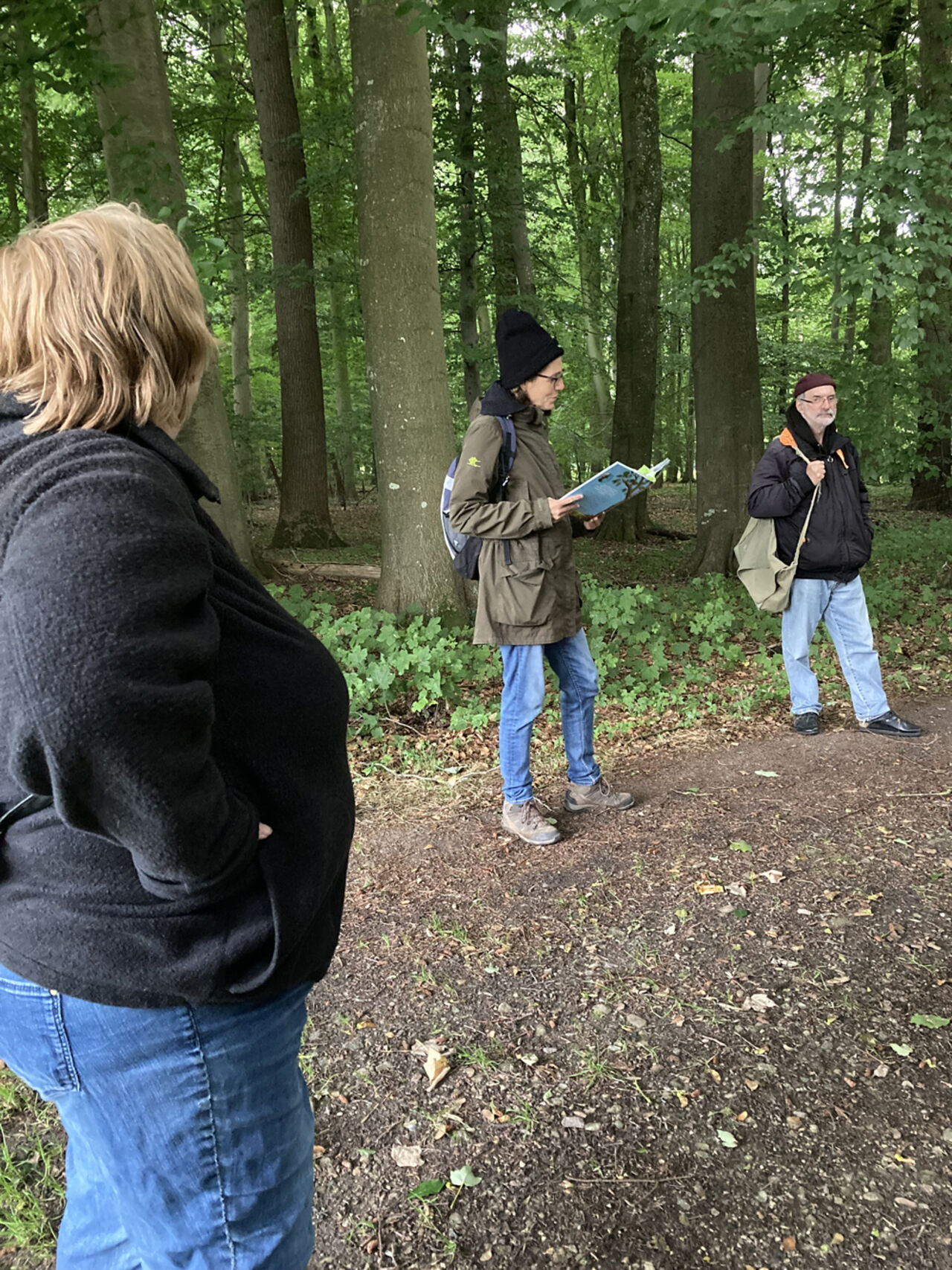 Den Rahmen gestaltete die Ehrenamtsgruppe der Erwachsenenbildung im Kirchenkreis Schleswig-Flensburg. So berichtete Detlef Flüh von seinen Begegnungen mit der Natur in diesem Wald und steckte alle mit seiner Begeisterung an. Mareike Brombacher las an einigen Stationen aus dem Buch „Hörst du, wie die Bäume sprechen“ von Peter Wohlleben vor. Heike Kaiser hatte die Anmeldungen organisiert. Beim kleinen Imbiss am Ende des Spaziergangs war man sich einig: Die Erfahrung, im Wald etwas über den Wald zu erfahren, war ein ganz besonderes Erlebnis. Und die Organisator*innen sind sich sicher: Einen solchen Spaziergang werden sie gerne wieder anbieten.