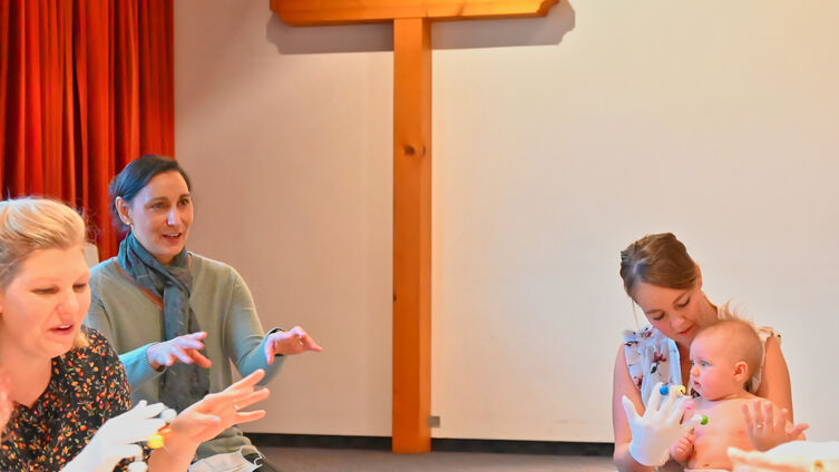 Käthe (6 Monate) und Adam (9 Monate) krabbeln aufeinander zu, während Kia (8 Monate) gerade gespannt dem Singen lauscht. Käthe, Adam und Kia sind drei von acht Kindern, die gemeinsam mit ihren Müttern an einem DELFI®-Kurs in Kropp teilnehmen. „Kleine Menschen, die hier Spaß haben und dabei viel lernen“, sagt die Kursleiterin Maike Bünger. Und auch die Mütter tauschen sich aus und lernen dabei viel – Themen wie Zahnen, Breikost und die neue Mutter-Rolle stehen gerade hoch im Kurs.
