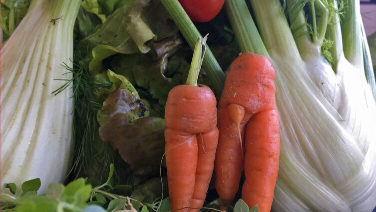 Mit Lebensmitteln spielt man nicht. Außer manchmal. Zum Beispiel, wenn Adam und Eva mit der Gemüsekiste für´s Wochenende ins Haus kommen. Der Garten Eden, das Paradies: Für mich ist es der Ort, an dem wir einander mit Liebe ansehen und mit Liebe angesehen werden. An dem wir uns zeigen können, wie wir sind. Nichts verbergen müssen. Daher ist das erste Paar der Bibel selbstverständlich nackt, schamlos im wahrsten Sinne des Wortes. Eine alte Geschichte, die sich jedesmal wiederholt, wenn Zwei sich unvoreingenommen entdecken. Und dabei merken, dass sie anscheinend früher irgendwann einmal Eins gewesen sein müssen und nun endlich wieder werden dürfen. Im anderen sich selbst entdecken. Bein von meinem Bein. Zueinander passen, als wäre man füreinander geschaffen. Fugenlosigkeit.
