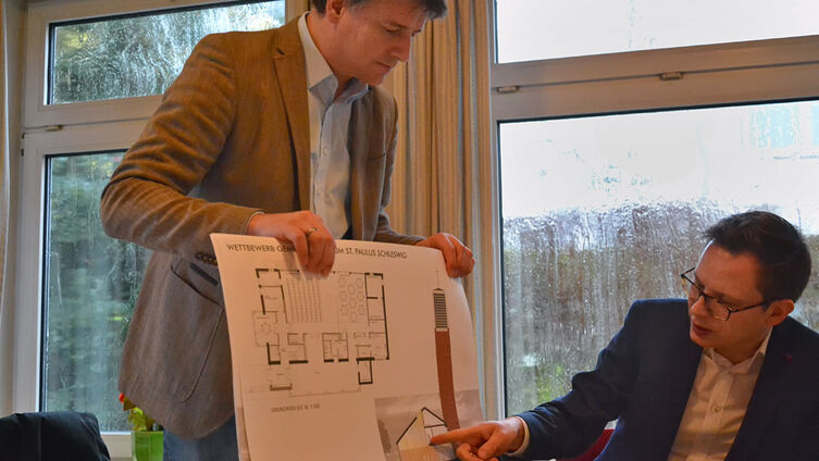 "Das ist ein Meilenstein auf dem Weg zum kirchlichen Gebäudekonzept für Schleswig", freut sich der Vorsitzende des Kirchengemeinderates, Dr. Michael Dübbers, der Anfang Dezember gemeinsam mit Architekt Manuel Dycker den Siegerentwurf präsentierte. Die Pläne des Gewinnerbüros Johannsen, Fuchs und Dycker aus Husum sowie die Entwürfe der fünf anderen Architekturbüros sind ab sofort und bis Ende Januar im Gemeindehaus in der Königsberger Straße in Schleswig ausgestellt.