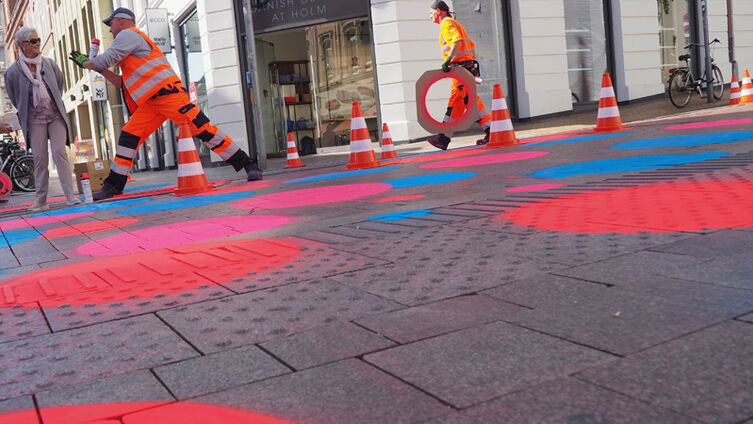 Flensburg ist die Stadt der Punkte. Klar. Doch seit ein paar Tagen wächst der Bestand um einige mysteriöse Exemplare. Rund um die Rathausstraße sprühen Herr Faatz und Herr Weidmann vom TBZ blaue, rote und rosafarbene Kreise auf das Pflaster. Fragende Gesichter und Stirnrunzeln sind den beiden sicher. „Sonst müssen Sie so etwas doch eher entfernen?“ wundert sich jemand. „Und das von unseren Steuergeldern!“ ruft ein anderer im Vorbeigehen.